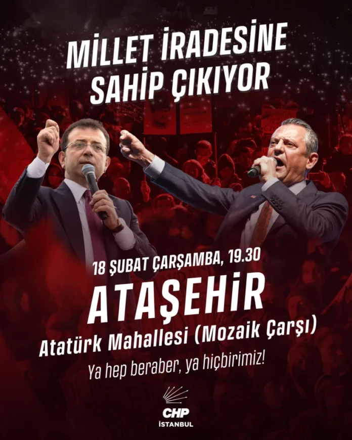 CHP’nin, İstanbul Büyükşehir Belediye Başkanı Ekrem İmamoğlu’nun tutuklanmasının ardından başlattığı “Millet İradesine Sahip Çıkıyor” mitingleri sürüyor. CHP, mitinglerin İstanbul’daki yeni durağının Ataşehir olacağını açıkladı.