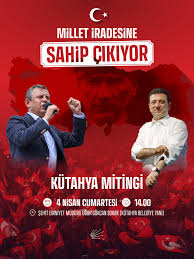 CHP’nin cumhurbaşkanı adayı ve İstanbul Büyükşehir Belediye (İBB) Başkanı Ekrem İmamoğlu‘nun tutuklamasının ardından başlattığı “Millet İradesine Sahip Çıkıyor” mitinglerinin 103’üncüsü yarın Kütahya’da yapılacak.