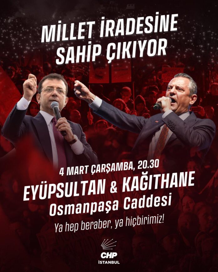 “Ya hep beraber, ya hiçbirimiz! Bölge mitinglerimizin ikincisini İstanbul 2. Bölgede gerçekleştiriyoruz. Genel Başkanımız Özgür Özel öncülüğünde, Cumhurbaşkanı adayımız Ekrem İmamoğlu ve tüm yol arkadaşlarımıza özgürlük için buluşuyoruz. Eyüpsultan – Kağıthane Osmanpaşa Caddesi 4 Mart Çarşamba, 20.30”