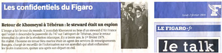 “Görüntü dünyayı dolaştı. Ayetullah Humeyni, İslam devriminin babasının 30 yıl önce, 1 Şubat 1979’da Tahran havaalanında 747’nin merdivenlerinden inmesine yardım eden bir Air France hostesinin kolunda, zaferle dönüşü. Aslında lacivert üniformalı adam, sürgüne gidişinden on beş yıl sonra İran kalabalığını ateşe verecek olan bu ayetullah hakkında bilgi toplamakla görevli bir Fransız istihbarat teşkilatı ajanıydı.”