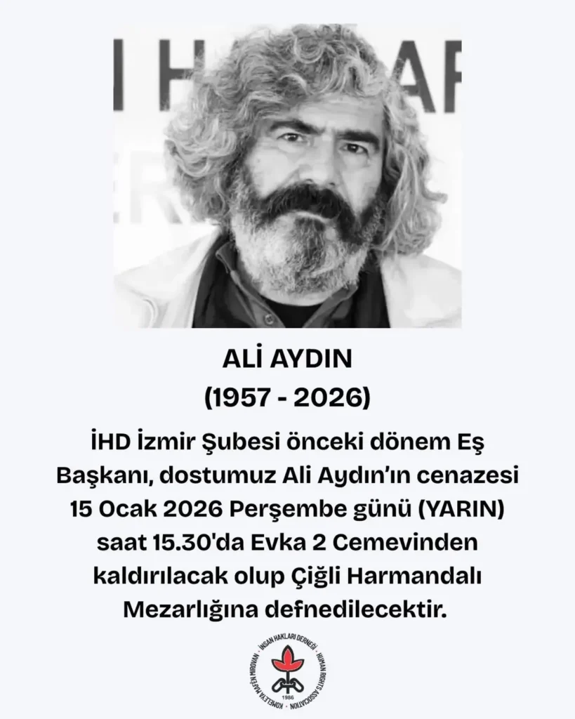 İnsan Hakları Derneği, Avukat Ali Aydın’ın Cenaze Programının netleştirdiğini duyurdu. Yapılan açıklamaya göre Aydın’ın cenazesi yarın saat 15.30’da Evka 2 Cemevi’nden kaldırılacak Çiğli Harmandalı Mezarlığında defnedilecek.