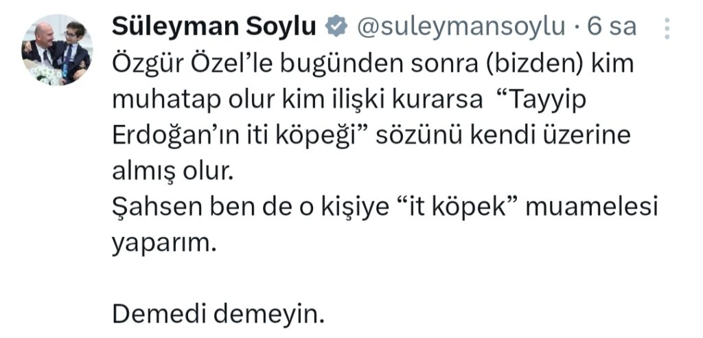 X(eski ismiyle twitter) hesabından yaptığı açıklamada Soylu şu ifadeleri kullandı: “Özgür Özel’le bugünden sonra (bizden) kim muhatap olur kim ilişki kurarsa “Tayyip Erdoğan’ın iti köpeği” sözünü kendi üzerine almış olur. Şahsen ben de o kişiye “it köpek” muamelesi yaparım. Demedi demeyin.”